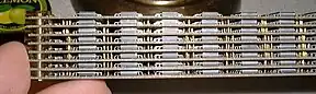 Six months later Cray had his "eureka" moment. He called the main engineers together for a meeting and presented a new solution to the problem. Instead of making one larger circuit board, each "card" would instead consist of a 3-D stack of eight, connected together in the middle of the boards using pins sticking up from the surface (known as "pogos" or "z-pins"). The cards were packed right on top of each other, so the resulting stack was only about 30 mm high.