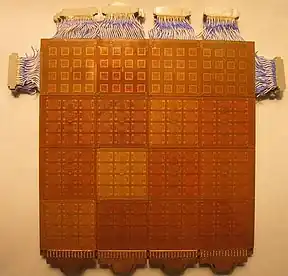 As with previous designs, the core of the Cray-3 consisted of a number of modules, each containing several circuit boards packed with parts. In order to increase density, the individual GaAs chips were not packaged, and instead several were mounted directly with ultrasonic gold bonding to a board approximately 1 inch (25 mm) square. The boards were then turned over and mated to a second board carrying the electrical wiring, with wires on this card running through holes to the "bottom" (opposite the chips) side of the chip carrier where they were bonded, hence sandwiching the chip between the two layers of board. These submodules were then stacked four-deep and, as in the Cray-2, wired to each other to make a 3D circuit.[21]