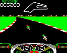 As the race begins, the player's bike is slow to accelerate so the rest of the field speed past. The player must attempt to catch and pass the other racers. The player may also gain bonus points by knocking the other racers off their bikes by side swiping them when the player is slightly in front. If the computer controlled racer is slightly in front when the bikes clash, it will cause the player to slow down. If the player hits the back of another bike, their bike is disabled for a short time.[2]
