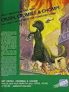 Crush, Crumble and Chomp! is a 1981 video game[1] where the player takes control of a movie monster and attacks a major city, such as New York or San Francisco. It was published in 1981 for the TRS-80, Apple II, and Atari 8-bit computers. Ports to the VIC-20, Commodore 64, and IBM PC compatibles were released later. Some versions were published under the company's original name of Automated Simulations, while the rest use Epyx.
