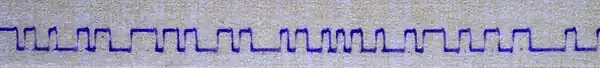Because a single missed or corrupted character could make decryption impossible, the greatest accuracy was required.[31] The undulator technology used to record the impulses had originally been developed for high-speed Morse. It produced a visible record of the impulses on narrow paper tape. This was then read by people employed as "slip readers" who interpreted the peaks and troughs as the marks and spaces of ITA2 characters.[32] Perforated paper tape was then produced for telegraphic transmission to Bletchley Park where it was punched out.[33]