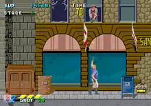 The gameplay is similar to Sega's own Shinobi (1987),[2] as the player has the ability to jump up and down between planes where possible. The goal of each of the game's 15 stages is to find and arrest a specific wanted criminal, who is usually fought at the end of the stage as a boss. Duke is initially armed with only a single-shot pistol, but upon arresting the first three criminals and being promoted to ESWAT, Duke is equipped with a Power Suit with a mounted machine gun for the rest of the game. The suit also has access to limited-use special weapons which can be found within stages. However, both of Duke's standard weapons require ammunition, without which the player can only attack with a kick. Additional ammunition can be found in boxes throughout each stage.