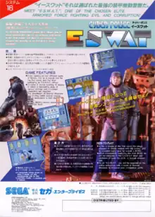 Cyber Police ESWAT (サイバーポリス イースワット) is a side-scrolling run and gun video game developed and released by Sega for arcades in 1989. Players take control of Duke Oda, a member of the Liberty City Cyber Police Force tasked with finding and arresting the city's most wanted criminals, and eventually dismantling a terrorist organization planning world domination. In 1990, Sega released a Mega Drive/Genesis version known in North America as ESWAT: City Under Siege.
