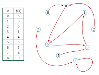 The figure shows a function f that maps the set S = {0,1,2,3,4,5,6,7,8} to itself. If one starts from x0 = 2 and repeatedly applies f, one sees the sequence of values