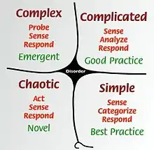 - 1 2 Snowden and Boone (2007): "The framework sorts the issues facing leaders into five contexts defined by the nature of the relationship between cause and effect. Four of these—simple, complicated, complex, and chaotic—require leaders to diagnose situations and to act in contextually appropriate ways. The fifth—disorder—applies when it is unclear which of the other four contexts is predominant."[2]