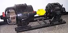 A motor–generator set, mainly of historical interest, consists of an electric motor and generator coupled together. A dynamotor combines both functions into a single unit with coils for both the motor and the generator functions wound around a single rotor; both coils share the same outer field coils or magnets.[4] Typically the motor coils are driven from a commutator on one end of the shaft, when the generator coils output to another commutator on the other end of the shaft. The entire rotor and shaft assembly is smaller in size than a pair of machines, and may not have any exposed drive shafts.