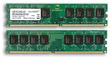 ![]() Front and back of a 2GB PC2-5300 DDR2 RAM module for desktop PCs (DIMM) | |
