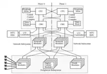 The CPU contains two identical 16-bit processors running in hot standby mode. The original CPU core was referred to as the NT40 CPU and was implemented in approximately 250 discrete logic devices across several circuit boards running at 36 MHz. The NT40 core consisted mainly of the NT1X44 stack card, which provides some register and stack functions of the processor, the NT1X45 which contained the arithmetic and logic functions, the NT1X46 which provides more registers and the load-route read-only memory (ROM) and the NT1X47 timing and control card which provides the micro-cycle source and microstore decoding functions of the processor.[2] The NT1X47 card also contained the 2-digit hexadecimal display to indicate test result codes and the condition of the core. The NT1X48 processor maintenance card contained a thumbwheel on the faceplate to enable various diagnostic tests of the CPU. A later modification of these same five circuit boards with faster pin-compatible discrete logic devices enabled the CPU to operate at 40 MHz allowing central offices to improve call throughput capacity by 10 percent.[3] When the CPU is configured in dual hot standby mode, a mate exchange bus (MEB) between the two CPUs enables the state of one CPU to be continuously compared to that of the other CPU on a cycle by cycle basis. Any discrepancy between the two CPUs results in maintenance circuitry determining which CPU is at fault and activity to change to the same CPU.