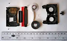 Small cassettes (66 x 48 x 12.2 mm),[28] also known as S-size or MiniDV cassettes, had been intended for amateur use, but have become accepted in professional productions as well. MiniDV cassettes are used for recording baseline DV, DVCAM, and HDV. These cassettes come in lengths up to about 14~20.8GB for 63 or 90min minutes of DV or HDV video.[29] When recording in DVCAM, these cassettes hold up to 41 minutes of video. There are some 83-minute versions but these use thinner tape than the 63-minute ones and Panasonic advised against playing these cassettes in DVCPRO decks.
