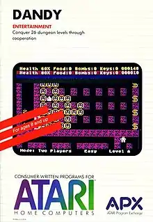 Dandy (later Dandy Dungeon) is a dungeon crawl maze video game for Atari 8-bit computers published by the Atari Program Exchange in 1983. It is one of the first video games with four-player, simultaneous cooperative play. Players equipped with bows and unlimited arrows fight through a maze containing monsters, monster spawners, keys, locked doors, food, and bombs in search of the exit leading to the next level. If a player dies, they can be revived by finding and shooting a heart. The game includes an editor for making new dungeons.