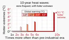 ![]() Projected (1) frequency and (2) intensity of extreme "10-year heat waves" are connected in pairs of horizontal and vertical bars, respectively. Bars are distinguished by (3) color-coded primary category (degree of global warming). |