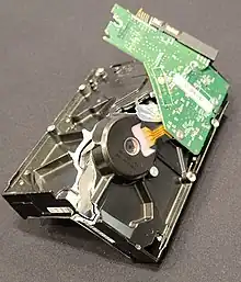 Degaussing is the removal or reduction of a magnetic field of a disk or drive, using a device called a degausser that has been designed for the media being erased. Applied to magnetic media, degaussing may purge an entire media element quickly and effectively.