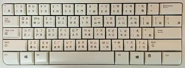 On most keyboards in Taiwan, most keys show four symbols. On the keys, the Latin letters are in the upper left, Bopomofo symbols on the upper right, Cangjie symbols on the lower left, and Dayi symbols on the lower right.