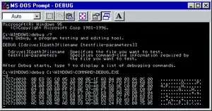 The line-oriented debugger DEBUG.EXE is an external command in operating systems such as DOS, OS/2 and Windows (only in 16-bit/32-bit versions[1]).