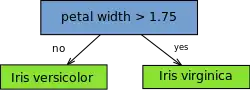A decision stump is a machine learning model consisting of a one-level decision tree.[1] That is, it is a decision tree with one internal node (the root) which is immediately connected to the terminal nodes (its leaves). A decision stump makes a prediction based on the value of just a single input feature. Sometimes they are also called 1-rules.[2]