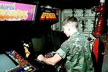 Defender was Williams Electronics' first attempt at developing a new video game; the company's earlier game was a Pong clone.[5] The popularity of coin-operated arcade games in 1979 spurred the company to shift its focus from pinball games to arcade games.[9] The company chose Eugene Jarvis, who had a successful record of Williams pinball games, to head development.[5] Larry DeMar, Sam Dicker, and Paul Dussault assisted Jarvis.[10] At the time, Williams had a small staff and the management was unfamiliar with technology used for its electronic games. As a result, the staff was afforded a large amount of creative freedom.[9]