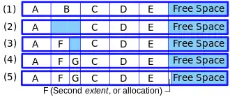 - Add a new block somewhere else, and indicate that F has a second extent (see example 5 in the image). Repeat this hundreds of times and the filesystem will have a number of small free segments scattered in many places, and some files will have multiple extents. When a file has many extents like this, access time for that file may become excessively long because of all the random seeking the disk will have to do when reading it.