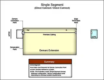 A demarcation point extension, or demarc extension is the transmission path originating from the interface of the access provider's side of a demarcation point within a premises and ending at the termination point prior to the interface of the edge Customer Premises Equipment (CPE). This may include in-segment equipment, media converters and patch cords as required to complete the circuit's transmission path to the edge CPE. A demarc extension is more correctly termed "Service Interface Extension", and may also be referred to as inside wiring, extended demarc, circuit extension, CPE cabling, riser cabling or DMARC extension.[3]
