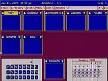 By the time Personal DeskMate was released with the Tandy 1000 EX, it was a GUI that acted as a portal for many other office productivity applications. The DeskMate application would run on top of MS-DOS. The user interface was made up of text. The applications that made up the suite were: