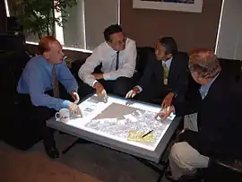 The DiamondTouch table is a front-projected interactive display that allows up to four users to sit face to face and work together on the same screen.[7] The DiamondTouch hardware enables a class of software known as "single-display groupware"[8] where collaborative work is supported by computer interfaces that allow participants to be physically close. While product literature[9] mentions consumer uses such as gaming,[10] customers of the DiamondTouch are using it for business and office applications.[11]