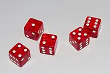 Diceware is a method for creating passphrases, passwords, and other cryptographic variables using ordinary dice as a hardware random number generator. For each word in the passphrase, five rolls of a six-sided die are required. The numbers from 1 to 6 that come up in the rolls are assembled as a five-digit number, e.g. 43146. That number is then used to look up a word in a cryptographic word list. In the original Diceware list 43146 corresponds to munch. By generating several words in sequence, a lengthy passphrase can thus be constructed randomly.