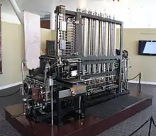 A difference engine is an automatic mechanical calculator designed to tabulate polynomial functions. It was designed in the 1820s, and was first created by Charles Babbage. The name difference engine is derived from the method of divided differences, a way to interpolate or tabulate functions by using a small set of polynomial co-efficients. Some of the most common mathematical functions used in engineering, science and navigation are built from logarithmic and trigonometric functions, which can be approximated by polynomials, so a difference engine can compute many useful tables.