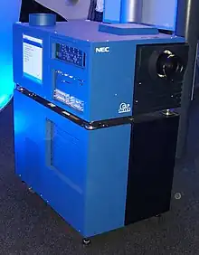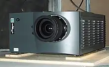 On February 2, 2000, Philippe Binant, technical manager of Digital Cinema Project at Gaumont in France, realized the first digital cinema projection in Europe[14] with the DLP CINEMA technology developed by Texas Instruments. DLP is the current market-share leader in professional digital movie projection,[15] largely because of its high contrast ratio and available resolution as compared to other digital front-projection technologies. As of December 2008, there are over 6,000 DLP-based Digital Cinema Systems installed worldwide.[16]