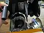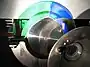 | Interior view of a single-chip DLP projector, showing the light path. Light from the lamp enters a reverse-fisheye, passes through the spinning color wheel, crosses underneath the main lens, reflects off a front-surfaced mirror, and is spread onto the DMD (red arrows). From there, light either enters the lens (yellow) or is reflected off the top cover down into a light-sink (blue arrows) to absorb unneeded light. Top row shows overall components, closeups of 4-segment RGBW color wheel, and light-sink diffuser/reflection plate on top cover. | |||