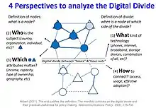 There are manifold definitions of the digital divide, all with slightly different emphasis, which is evidenced by related concepts like digital inclusion,[14] digital participation,[15] digital skills,[16] media literacy,[17] and digital accessibility.[18]
