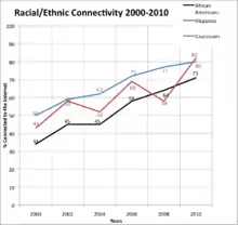 Generally, racial minorities have demonstrated lower levels of access and knowledge ICTs and of owning infrastructure to utilize the connection.[25] In 2000, 50% of Whites had access to the Internet compared to 43% of Hispanics and 34% of African Americans.[26] Between 2000 and 2010, the racial population of Internet users became increasingly similar to the racial makeup of the United States population, demonstrating a closing racial divide.[27] In 2019, 79% of Whites had access to broadband compared to 61% of Hispanics and 66% of African Americans.[20]