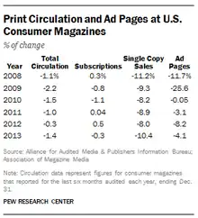 Since 2004, there has been a decrease in newspaper industry employment, with only about 40,000 people working in the workforce currently.[43] Alliance of Audited Media & Publishers information during the 2008 recession, over 10% of print sales are diminished for certain magazines, with a hardship coming from only 75% of the sales advertisements as before.[37] However, in 2018, major newspapers advertising revenue was 35% from digital ads.[43]