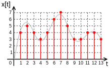 In digital signal processing, a digital signal is a representation of a physical signal that is sampled and quantized. A digital signal is an abstraction that is discrete in time and amplitude. The signal's value only exists at regular time intervals, since only the values of the corresponding physical signal at those sampled moments are significant for further digital processing. The digital signal is a sequence of codes drawn from a finite set of values.[10] The digital signal may be stored, processed or transmitted physically as a pulse-code modulation (PCM) signal.