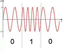 In digital communications, a digital signal is a continuous-time physical signal, alternating between a discrete number of waveforms,[3] representing a bitstream. The shape of the waveform depends the transmission scheme, which may be either a line coding scheme allowing baseband transmission; or a digital modulation scheme, allowing passband transmission over long wires or over a limited radio frequency band. Such a carrier-modulated sine wave is considered a digital signal in literature on digital communications and data transmission,[11] but considered as a bit stream converted to an analog signal in electronics and computer networking.[12]