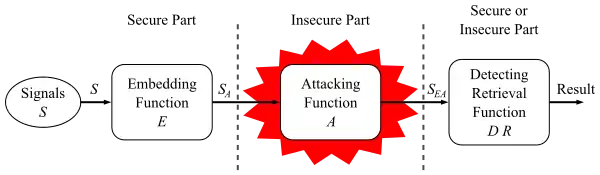 The information to be embedded in a signal is called a digital watermark, although in some contexts the phrase digital watermark means the difference between the watermarked signal and the cover signal. The signal where the watermark is to be embedded is called the host signal. A watermarking system is usually divided into three distinct steps, embedding, attack, and detection. In embedding, an algorithm accepts the host and the data to be embedded, and produces a watermarked signal.