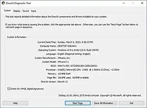 DirectX Diagnostic Tool (DxDiag) is a diagnostics tool used to test DirectX functionality and troubleshoot video- or sound-related hardware problems. DirectX Diagnostic can save text files with the scan results. These files are often posted in tech forums or attached to support emails in order to give support personnel a better idea of the PC the requester is using in case the error is due to a hardware failure or incompatibility. It has been bundled with Windows since Windows 98 Second Edition (DirectX 6).