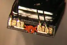 First introduced in 1979 on the IBM 3370 disk drive, thin-film technology uses photolithographic techniques similar to those used on semiconductor devices to fabricate hard drive heads. At the time, these heads had smaller size and greater precision than the ferrite-based heads then in use; they were electronically similar to them and used the same physics. Thin layers of magnetic (Ni–Fe), insulating, and copper coil wiring materials were built on ceramic substrates that were then physically separated into individual read/write heads integrated with their air bearing, significantly reducing the manufacturing cost per unit.[5] Thin-film heads were much smaller than MIG heads and therefore allowed smaller recorded features to be used. Thin-film heads allowed 3.5 inch drives to reach 4 GB storage capacities in 1995. The geometry of the head gap was a compromise between what worked best for reading and what worked best for writing.[4]