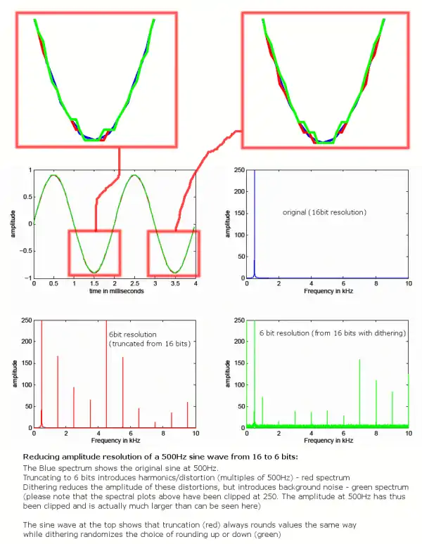 - What is Dither? Article previously published in Australian HI-FI with visual examples of how audio dither sharply reduces high order harmonic distortion.