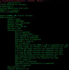 dmidecode is a free userspace command-line utility for Linux that can parse the SMBIOS data.[1][2] The name dmidecode is derived from Desktop Management Interface, a related standard with which dmidecode originally interfaced. SMBIOS was originally named DMIBIOS. The Linux kernel and other modern operating systems such as the BSD family contain an SMBIOS decoder, allowing systems administrators to inspect system hardware configuration and to enable or disable certain workarounds for problems with specific systems, based on the provided SMBIOS information. Information provided by this utility typically includes the system manufacturer, model name, serial number, BIOS version and asset tag, as well other details of varying level of interest and reliability, depending on the system manufacturer. The information often includes usage status for the CPU sockets, expansion slots (including AGP, PCI and ISA) and memory module slots, and the list of I/O ports (including serial, parallel and USB).[3][4] Decoded DMI tables for various computer models are collected in a public GitHub repository.[5]