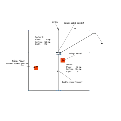 Each sector contains a number of properties: a floor height, ceiling height, light level, a floor texture and a ceiling texture. To have a different light level in a particular area, for example, a new sector must be created for that area with a different light level. One-sided linedefs therefore represent solid walls, while two-sided linedefs represent bridge lines between sectors.