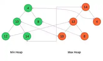 - Removing the min element: Perform removemin() on the min heap and remove(node value) on the max heap, where node value is the value in the corresponding node in the max heap.