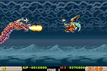 Bahamoot can also spit fireballs. By holding the fire button down, the dragon will build up fire in its mouth; the longer the button is held down, the more powerful the fireball will be. There are four levels of fireball power; at its strongest, the fireball resembles a dragon's head. The game also contains some platforming elements - the human is able to dismount on horizontal platforms.