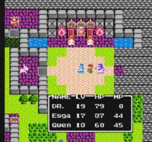To win, the player must fight monsters to improve the characters' experience levels and get gold to buy better weapons and armor. Eventually, the player's characters become strong enough to make it to the next town or dungeon. This repeats until the player reaches the final boss and defeats him. However, the gameplay is not necessarily linear, especially after the player gets the boat. Exploration is a key component of the game. The game offers a few spots to save the game.[9] In most of the towns, talking to a king or minister saves the game. In the American version, which incorporated a battery for saved games rather than the password system of the original, talking to the king also allows for the deletion and moving of saved games.[10]