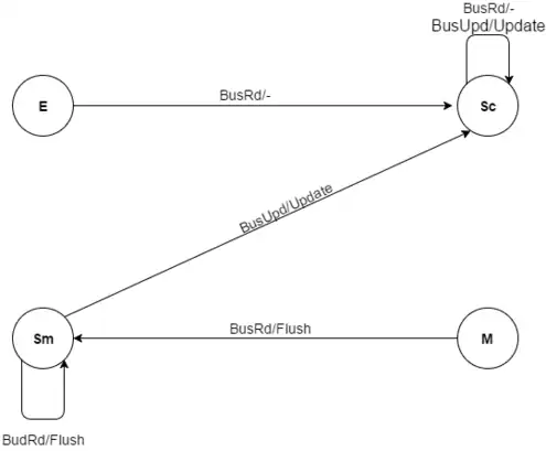 - If the cache block is in Shared Modified state, and a bus update (BusUpd) transaction is issued, the state transitions to Shared Clean, all the caches are updated.