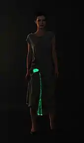 In 1968, the Museum of Contemporary Craft in New York City held a ground-breaking exhibition called Body Covering that focused on the relationship between technology and apparel. The show featured astronauts' space suits along with clothing that could inflate and deflate, light up, and heat and cool itself.[7] Particularly noteworthy in this collection was the work of Diana Dew,[8] a designer who created a line of electronic fashion, including electroluminescent party dresses and belts that could sound alarm sirens.[9]
