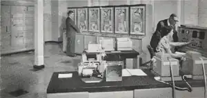Main storage capacity was 1,024 36-bit words - just over 4k bytes. Secondary storage was provided by magnetic drums, each of 4,096 words - about 20k. Anything else was stored on 1-inch-wide (25 mm) magnetic tape mounted in the vertical drive, vacuum-sealed behind a glass door. Peripherals included punched tape readers, punched card readers, and line printers.