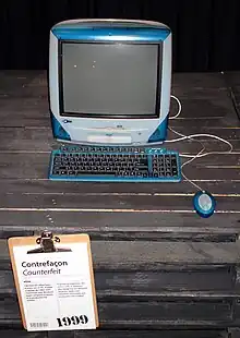 Upon its release in 1999, the eOne came with a translucent "cool blue" case, while the original iMac had a two-toned case with "Bondi Blue" accents. At US$799, the eOne was also cheaper than the US$1,199 iMac. eMachines hoped to avoid legal trouble because the shape of the computer was different from the iMac. However, Apple sued eMachines, alleging that the computer's design infringed upon the protected trade dress of the iMac.[1] In March 2000, eMachines reached a settlement with Apple, under which it agreed to discontinue the infringing model.[2]