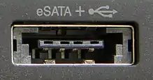 In computing, eSATAp (also known as Power over eSATA, Power eSATA, eSATA/USB Combo, eSATA USB Hybrid Port/EUHP) is a combination connection for external storage devices. An eSATA or USB device can be plugged into an eSATAp port. The socket has keyed cutouts for both types of device to ensure that a connector can only be plugged in the right way.