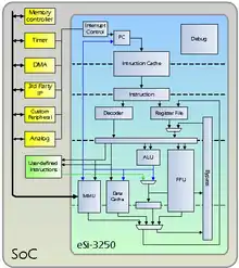 eSi-RISC is a configurable CPU architecture. It is available in five implementations: the eSi-1600, eSi-1650, eSi-3200, eSi-3250 and eSi-3264.[1] The eSi-1600 and eSi-1650 feature a 16-bit data-path, while the eSi-32x0s feature 32-bit data-paths, and the eSi-3264 features a mixed 32/64-bit datapath. Each of these processors is licensed as soft IP cores, suitable for integrating into both ASICs and FPGAs.[2]