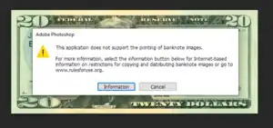 Since 2003, image editors such as Adobe Photoshop CS or Paint Shop Pro 8 refuse to print banknotes. According to Wired.com, the banknote detection code in these applications, called the Counterfeit Deterrence System (CDS), was designed by the Central Bank Counterfeit Deterrence Group and supplied to companies such as Adobe as a binary module.[12] Experiments by Steven J. Murdoch and others showed that this banknote detection code does not rely on the EURion pattern.[13] It instead detects a digital watermark embedded in the images, developed by Digimarc.[14]
