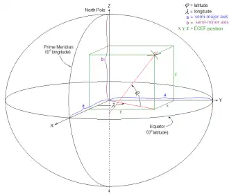 The Earth-centered, Earth-fixed coordinate system (acronym ECEF), also known as the geocentric coordinate system, is a cartesian spatial reference system that represents locations in the vicinity of the Earth (including its surface, interior, atmosphere, and surrounding outer space) as X, Y, and Z measurements from its center of mass.[1][2] Its most common use is in tracking the orbits of satellites and in satellite navigation systems for measuring locations on the surface of the Earth, but it is also used in applications such as tracking crustal motion.